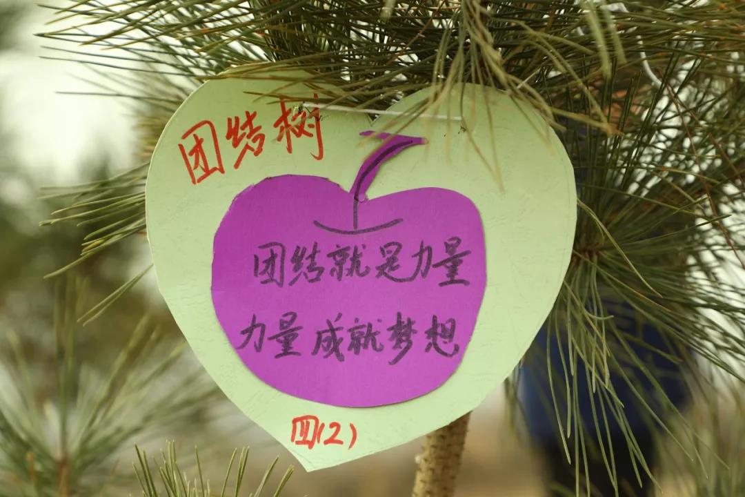 种植一份希望,梦想一片未来。以班级为单位,每班的学生把写有寄语的心愿卡系在了自己栽种的松树上。从学生微笑的脸庞上,我们能感受到他们满满的喜悦和成就感。